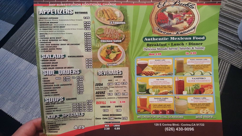 Introducing the menu at El Pueblo Restaurant, a cozy spot in Covina specializing in Mexican breakfast and brunch options. From delicious appetizers like Enchiladas and Carne Asada Fries to mouthwatering breakfast dishes like Chilaquiles and Huevo con Chorizo Burrito, there is something for everyone to enjoy. The menu boasts a variety of options for vegetarians and meat-lovers alike, all prepared with fresh ingredients and authentic flavors. Whether you're looking for a hearty breakfast or a casual brunch spot, El Pueblo Restaurant has you covered. With convenient amenities like delivery, takeout, and reservations, it's easy to satisfy your cravings at this inviting eatery. Don't miss out on the chance to experience the flavors of Mexico right here in California at El Pueblo Restaurant.